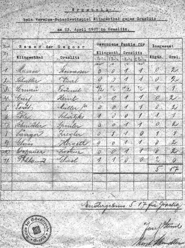 Vereins-Schachwettspiel Klingenthal gegen Graslitz 23.04.1927